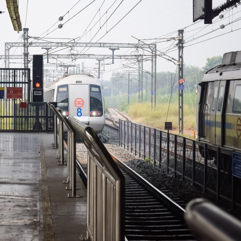 New Delhi, India, August 12 2024 – Delhi Metro train arriving at Jhandewalan metro station in New Delhi, India, Asia, Public Metro departing from Jhandewalan station